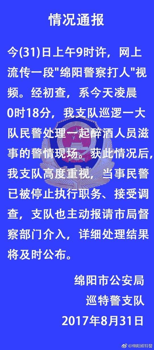 8月31日上午,一段绵阳警察打骂醉酒者的视频在网上疯传。绵阳市公安局巡特警支队发布情况通报称,视频系今天凌晨0时18分,绵阳巡特警支队巡逻一大队民警处理一起醉酒人员滋事的警情现场。目前,当事民警已被停止执行职务、接受调查。据视频拍摄者透露,是醉酒男子先动手打警察。 在这个视频时长一分多钟里,一名男子躺在地上,另外有三名男子在旁边,其中还有两名穿制服的巡特警。其中一名巡特警对躺在地上的男子进行脚踢,并口中带有脏话,同时称“还打警察、拘留”等话语。 视频中,躺在地上男子的同伴一直在劝解,称该男子“喝醉了。” 当天上午8点,记者联系上了视频拍摄者,他介绍,事情发生在31日凌晨,地点为绵阳索桥附近,当时他刚好开车经过,几名喝多了酒的人在路边,还有一名女子已经打车离开。躺在地上的男子先动手打了其中一名警察。 11时,绵阳市公安局巡特警支队发布情况通报:今(31)日上午9时许,网上流传一段"绵阳警察打人"视频。经初查,系今天凌晨0时18分,我支队巡逻一大队民警处理一起醉酒人员滋事的警情现场。获此情况后,我支队高度重视,当事民警已被停止执行职务、接受调查,支队也主动报请市局督察部门介入,详细处理结果将及时公布。