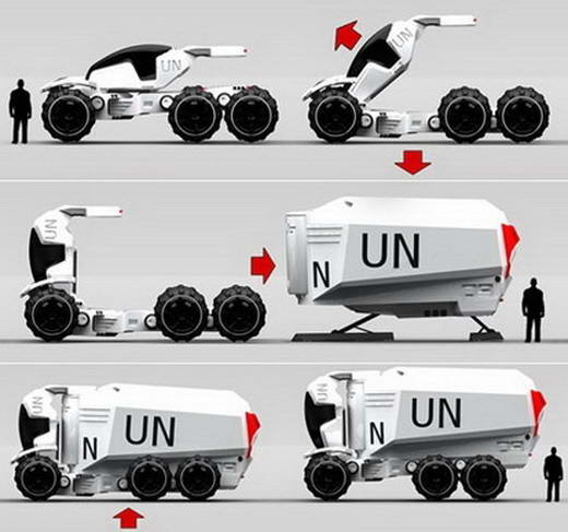 为了帮助像联合国这样的人道主义组织方便运送食物,水,医疗设备及临时住所等物资到灾难地区,Bryan Lee特别设计了A.N.T这种救援运输车。