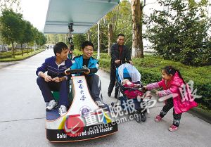 没气没油,再好的车也只能瘫痪———最近,西南大学十几位大学生就发明了这样一辆不需加气、不需喝油的太阳能汽车。昨日,大学生们自豪地告诉记者:“我们的车很低调,给点阳光就能开走,遇到下雨天,还可当自行车用。”