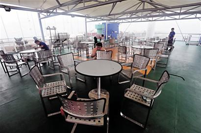 在二层客舱,记者发现这里已经变成了一个多功能厅,厅内设有吧台和一个圆形舞池。多功能厅的四个角上都安装有42寸的液晶电视,中央位置搭设了一个舞台,并配备了音响以及点歌设备。在多功能厅的出口位置设有自助餐台以及吧台,可以提供各类休闲小吃和酒水。在原来客舱露天区域已经改造成带有罩棚的休闲观光平台,放置了轻便座椅和圆形小桌。