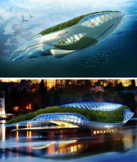 设计师文森特·卡雷巴特(Vincent Callebaut)创作了一个鲸鱼形状的“漂浮之城”——“僧帽”(Physalia),旨在令其漂流于世界各地的河流之上,从而消除污染,净化河水。这是一个自给自足的生态系统,可借助自身的“光合作用”获得所需的能源,并通过生物过滤减少水污染。这座“城市”里面到处是花园,表面覆盖着绿顶以及超薄太阳能电池板。