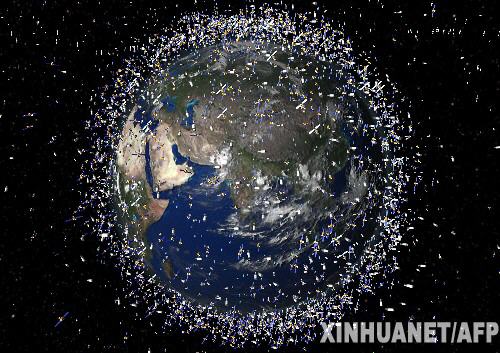 2009年2月10日,美俄卫星相撞。这是人类历史上首次发生完整的在轨卫星相撞事件。图为欧洲航天局发布的电脑合成照片显示约有12000块太空碎片围绕地球运转,太空原来如此拥挤。新华社/法新