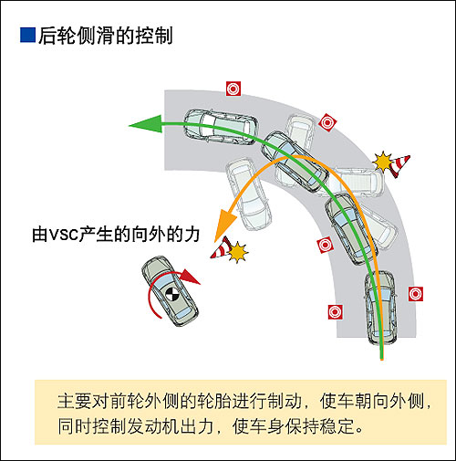 对各车轮轮胎进行适当制动,使车朝向内侧。同时控制发动机出力,使车辆不会冲出车道。 2.后轮侧滑的控制
