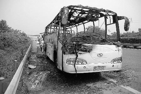 昨日上午11时30分,几名交警正在现场指挥拖车把这辆烧得面目全非的客车拖走。