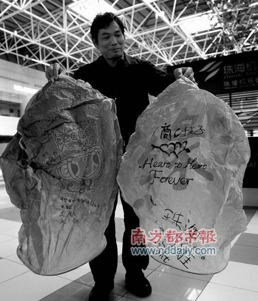机场工作人员捡获的孔明灯上写满了各种心愿。