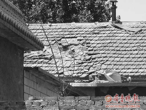 记者看到,村东一处大门紧闭的院落外聚集了多名村民,院内北屋房顶被砸了一个坑,一辆警车停在该院外,多名身着警服的男子在院内调查。