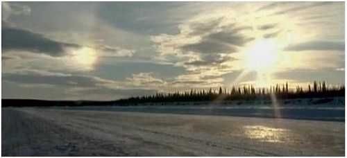 傍晚时分,最危险的路段到了。这一段路是冰冻的波福海——车辆已经从冰河开到了冻结的海上。最后30公里是非常难以预测的路况,因为海水不像淡水那样容易结冻,所以波福海很容易破裂。在路上开过去时,经常看到潮汐造成的巨大裂缝。波浪、潮汐和风还会造成一些锯齿形的冰块,像刀一样伸出地面,叫压力脊。高度从1到4.5公尺不等。千万不能撞上它们。