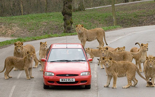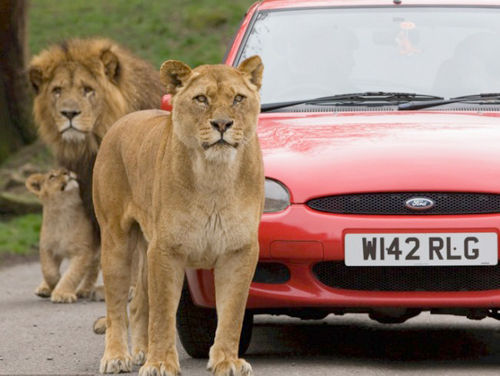 在英国诺斯利野生动物园,10多头狮子在围观车内游客。