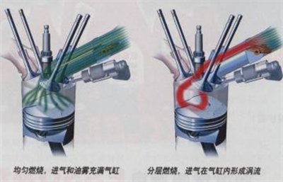 直喷技术产生了2个新的概念:均匀燃烧和分层燃烧 均匀燃烧:在全负荷时燃油喷射与进气同步燃油得到完全雾化,使混合汽均匀地充满燃烧室自然会得到充分的燃烧使发动机动力得到淋漓尽致的发挥。在均匀燃烧时有着和传统喷射发动机相同的空气与燃油混合比,即空燃比是14.7:1此时的lambda值是1。而燃油的蒸发又使混合汽降温去除了爆震的产生。也就是说在均匀燃烧情况下,在获得高动力输出和扭矩值的同时付出了较低的燃油消耗。勒芒耐力赛就可证明因为比赛中总是在均匀燃烧状态。 |
