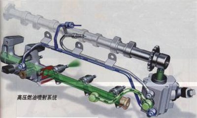 供油系统的主要部件是:高压油泵、共轨、燃油压力传感器、压力控制阀、高压喷嘴和ECU。首先是对喷嘴的要求提高了,以前的喷嘴是安装在进气歧管今天不同了,亲临前线安装在了燃烧室,自然要经受住烈火的考验。高压电磁喷嘴扮演着重要的角色,电磁单元被激活的时间和油压决定了喷射量的多少燃油喷射时间则被控制在几千分之一秒。 在奔驰C200 CGI发动机上燃油以42度角喷入汽缸,燃油压力随发动机的工作特性从50-120巴。而传统4缸汽油喷射发动机的喷射压力是38巴。高压油泵由进气凸轮轴驱动轨道中的油压由发动机电脑调节,并直接连接到喷嘴。压力信号取自压力传感器。部分负荷时在低转速下压力是4到5巴满足稀薄燃烧。奥迪的高压油泵同样由凸轮轴驱动,喷射压力最高到110巴。另一个需要具备的基本条件是要使用低硫汽油。