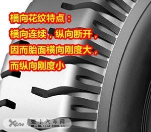 这种花纹的特点是胎面横向连续,纵向断开,因而胎面横向刚度大,而纵向刚度小。故轮胎抗滑能力呈现出纵强而横弱,汽车以较高速度转向时,容易侧滑;轮胎滚动阻力也比较大,胎面磨损比较严重。这种型式花纹适合于在一般硬路面上、牵引力比较大的中型或重型货车使用。 b)纵向花纹