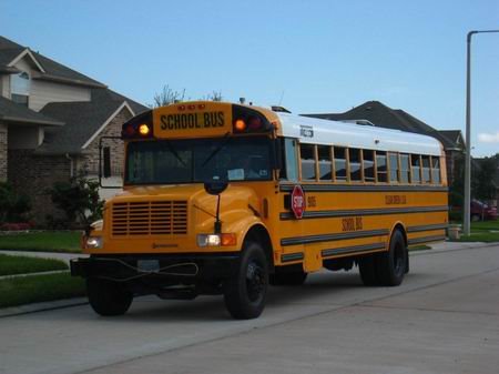 校车也叫Yellow Bus,因为车子是黄颜色的。黄颜色可表示警戒。校车在停车点停下,孩子上下车时,法律规定,所有的来往车辆(包括总统的车子和对面来车,因为活泼的孩子很可能从车前或车后冲出来)都必须停下,等校车关门并收起停(STOP)的标识后,才能通行。