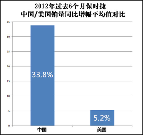 中国市场对于保时捷来说已经逐渐成为核心市场,2012年1至7月份中国贡献了保时捷全球22%的市场份额,而从上图不难看出,如果算上美国市场的话这两大市场的总和已经接近全球的一半,并且还在保持持续增长的趋势。