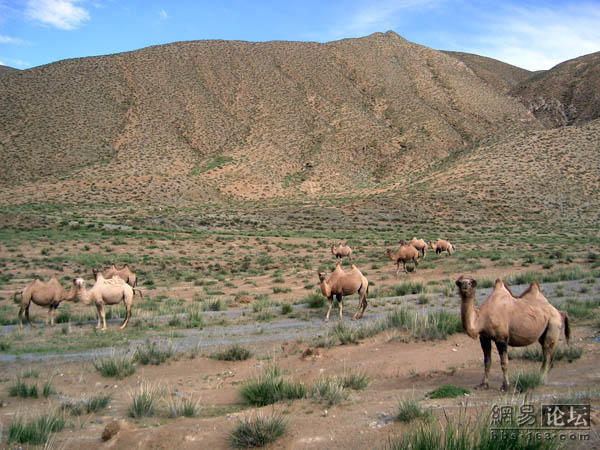 噢!骆驼!狂奔过去,好可爱的大精灵,睫毛忽闪忽闪,嘴里还嚼着草。4只转过头来看着我,好温柔的眼神儿哪。坐在地上逗留一会再走吧。管他还有几百公里才到格尔木呢。