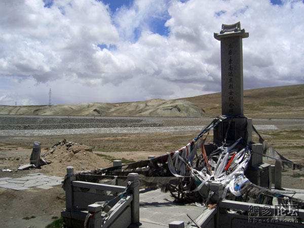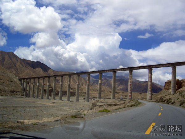 三岔河特大桥,耸立在玉珠峰北侧的峡谷,它是青藏铁路第一座高架桥,也是最高的高架。拔地而起的气度的确不凡。照片中右起第3根和第4跟桥墩之间立竣工纪念碑。