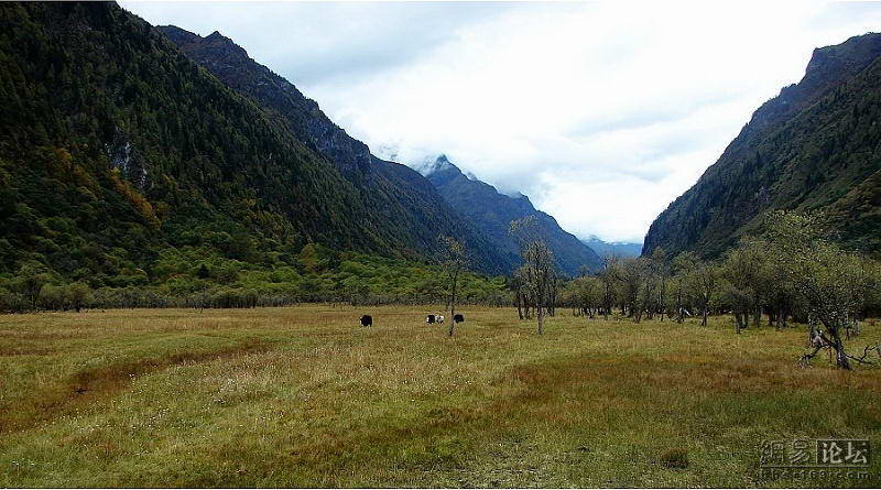 越往下行,山谷逐渐开阔,人参果坪是一大片草地。在这样的峡谷中能有一片平地真是奇迹,山峰环抱,丛林拱衬,中间是缎子一样的茂盛的水草,就像一大块生日蛋糕。草地中散布着几头牦牛,正悠闲的打发秋日时光。天气虽已转冷,但草色还是那么翠绿,刚下过一阵子雨,看着越发润泽。草间星星点点,是数不清的蓝紫色的小花。
