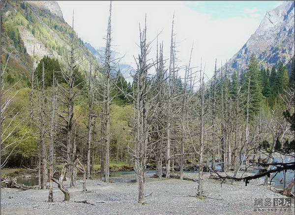 继续前行,视野逐渐开阔,倒不是因为林子稀了,而是到了一个大的滩头。这儿是栈道的尽头——枯树滩。水很浅,但流得很急,溪水中是几块露出的滩头小岛。岛上和浅水中,立着几株枯树,高大挺直,像是死去的雪杉。摊贩、马队都在这儿聚积,各自吆喝着自己的生意。游人铺散开来,或骑马穿林,或品味烧烤。更多的,是踩着跨在溪中的横木到岛上去戏水、拍照。