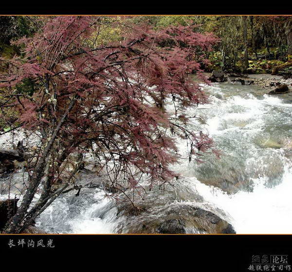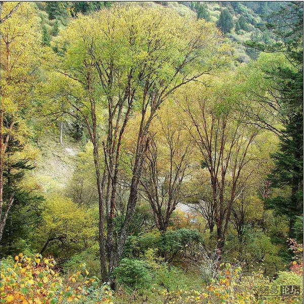 车先到的是最末一个景点——红杉林,下车老婆就喊冷,抱怨我没决定带羽绒服。冷是有点,呼出的都是白气,不过只要走动起来也还能忍受。红杉林景点是这儿海拔最高的地方,四面都是雪峰,中间一小片盆地,树林都是原生态的,以红杉树居多而得名。树丛很密,各种植被竞相生长,藤萝密布,聚花如织。游人多在坪口上耍,往林中走的很少。沿着林中铺设的木板栈道徐徐前行,听幽林深处间或传来的鸟鸣,看融雪化作的潺潺溪水,很是享受。