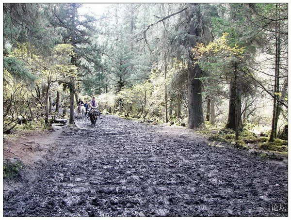 再往前走就只有泥泞的马道了,继续前行的人不多。我们租了防水的雨靴,深一脚浅一脚的跋涉。这也叫路啊,简直就是沼泽,林中的路就是被马踏出来的无数个蹄印,像一长遛杂乱排着的蜂窝煤。还是有些骑马的人,晃晃悠悠在林中穿行。那些穿旅游鞋甚至是皮鞋的游客就很惨了,只能顺着路边找有石头或是稍微干点的地方一步步跳着走。路虽然烂,但景色很美,真的是没有开发过的原始景观。林子很密,阳光透过树冠在地上撒下稀稀拉拉的斑点。一些树叶已经变色了,或金黄或火红,为这一片冷杉林多少点缀出些暖意。