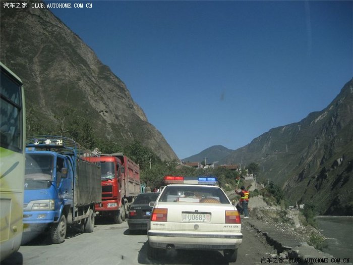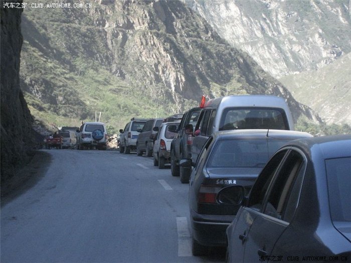 川主寺收费站前蜿蜒的河道上蜿蜒的车龙