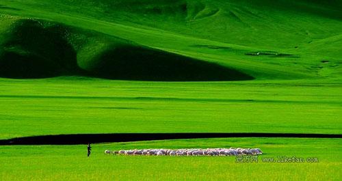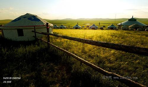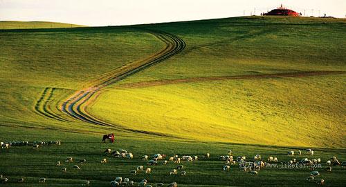 夏季牧羊 三、呼伦贝尔草原 呼伦贝尔草原位于大兴安岭西侧,东西300公里,南北200公里,面积约10万平方公里。呼伦贝尔大草原是中国目前仍保持完美(没被污染)的草原之一。 1、金帐汗部落 金帐汗蒙古部落坐落在陈巴尔虎旗境内,是呼伦贝尔境内唯一以游牧部落为景观的旅游景点,位于呼伦贝尔草原上号称“北疆第一曲水”的莫尔格勒河畔,是呼伦贝尔三大草原旅游点中景色最美的一个,离海拉尔约40分钟车程。这里是中外驰名的天然牧场,也是“天苍苍,野茫茫,风吹草低见牛羊”的呼伦贝尔草原腹地。12世纪末至13世纪初,一代天骄成吉思汗曾在这里秣马厉兵,与各部落争雄,最终占领了呼伦贝尔草原。金帐汗部落景点的布局,就是当年成吉思汗行帐的缩影和再现。 金帐汗蒙古部落距海拉尔市区38公里,可乘去往拉布大林方向的班,告诉司机在“金帐汗”下车,车会停在公路边,下车再往西走800米左右就是金帐汗。也可乘出租车前往。 2、呼和诺尔 呼和诺尔草原在呼伦贝尔盟陈巴尔虎旗,坐落在呼和诺尔湖畔的高岗上,距海拉尔市约54公里,是呼伦贝尔草原的一部分,也是当地最具代表性的草原民俗旅游点。乘海拉尔去往满洲里方向的长途汽车,在301国道1340公里里程碑处下车,向北走500米即是。也可乘出租车前往,人多的话租车去陈旗或进草原是很好的选择。海拉尔有到各旗的车,到陈旗的尤其多,每20分钟就有一趟。 草原内有许多大大小小的河流湖泊,其中呼和诺尔湖景色最佳,湖面四周绿草如茵,湖水清澈洁净,犹如一颗闪亮的明珠,湖边不时有野生的白鹭飞起,岸边不时有只会往前而不会拐弯的青蛙跳起跳落。夏季草原上水草丰美,牛羊遍野,蓝天白云下,景色异常优美。在草原上,你可以住在蒙古包中,真正体味一下蒙古民族特有的风情。 3、巴彦胡硕敖包山 呼伦贝尔境内另外一个草原旅游点是巴彦胡硕敖包山旅游点,隶属鄂温克自治旗,位于敖包山南部伊敏河畔的岗阜上,距海拉尔39公里。 建议租车从海拉尔到鄂温克旗的白音呼硕草原,毕竟,风景都在路上。全程只需20分钟,出租车费用在50元左右。 4、说明 在旅游点消费相对于呼伦贝尔境内的其他消费来说是比较贵的;去的时候多带点衣物和防蚊用品,草原上早晚温差很大,蚊子种类也很多,有一种毒蚊子非常厉害,最好作些准备。