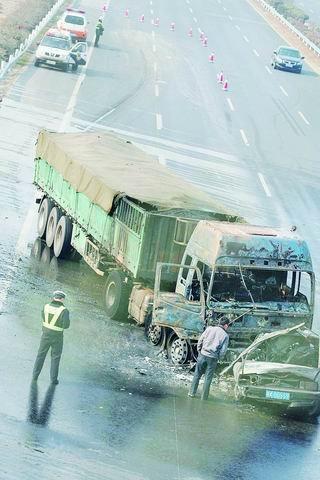 近日,连霍高速公路郑州沟赵收费站附近发生一起惨烈车祸,一辆山东籍载煤大货车追尾撞上一辆桑塔纳,引发轿车油箱着火,至少导致桑塔纳车内2人死亡(如图)。
