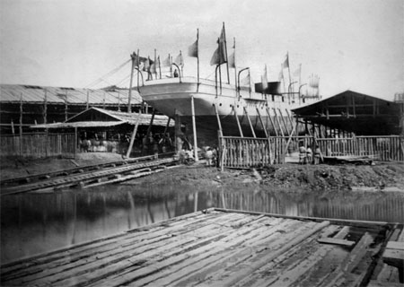 “万年清”即将下水时的照片,可以看到原本垫在船体下方的船台枕木已经被一根根木撑代替。此时的“万年清”船体已经完成,但是桅杆、烟囱等上层建筑还需在下水后装配。