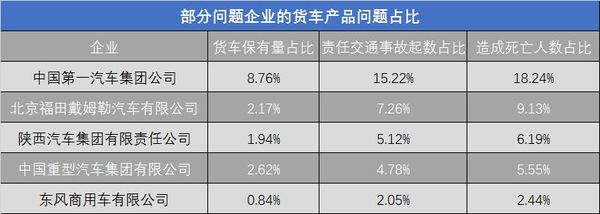 这些问题反映出部分企业在车辆生产环节存在的严重缺陷,隐患车辆一旦流入市场,不仅直接伤害了购车人的合法权益,也给交通安全埋下严重隐患。据统计,部分问题企业的货车产品涉及交通事故起数、造成死亡人数占全国货车交通事故的比率,明显高于其产品保有量占全国货车保有量的比率,如下图所示:
