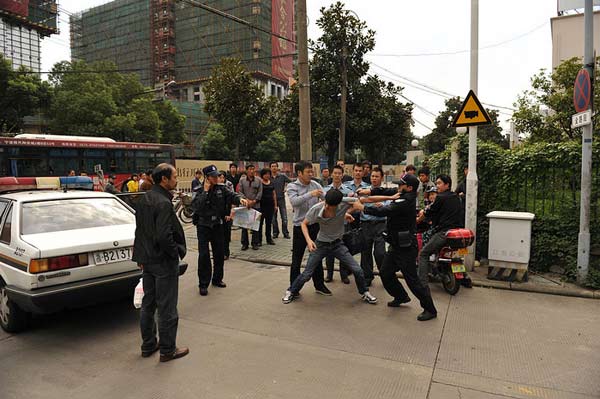 10点58分接到报警,说医院北门有人打架。我和一名协警开了辆警车过去,医院北门在一条小弄堂里,穿出去就是甬港北路。