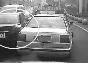 遮住前后牌照的黑色别克轿车在拥挤的道路上横冲直撞,先后碰上12辆车子后,迅速逃离。(画圈处为肇事车辆)现代快报记者施向辉翻拍于视频