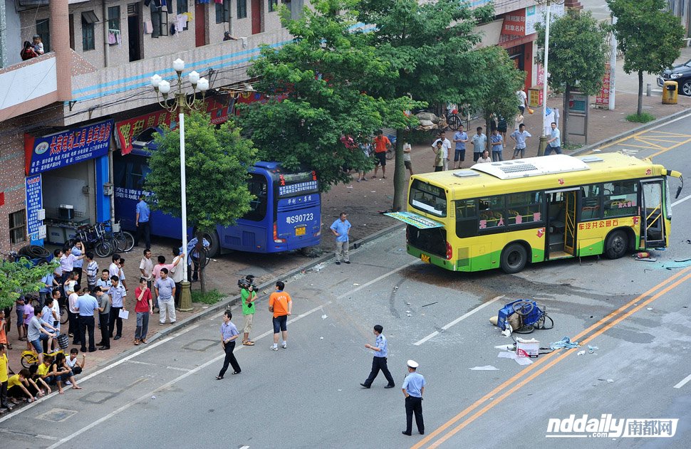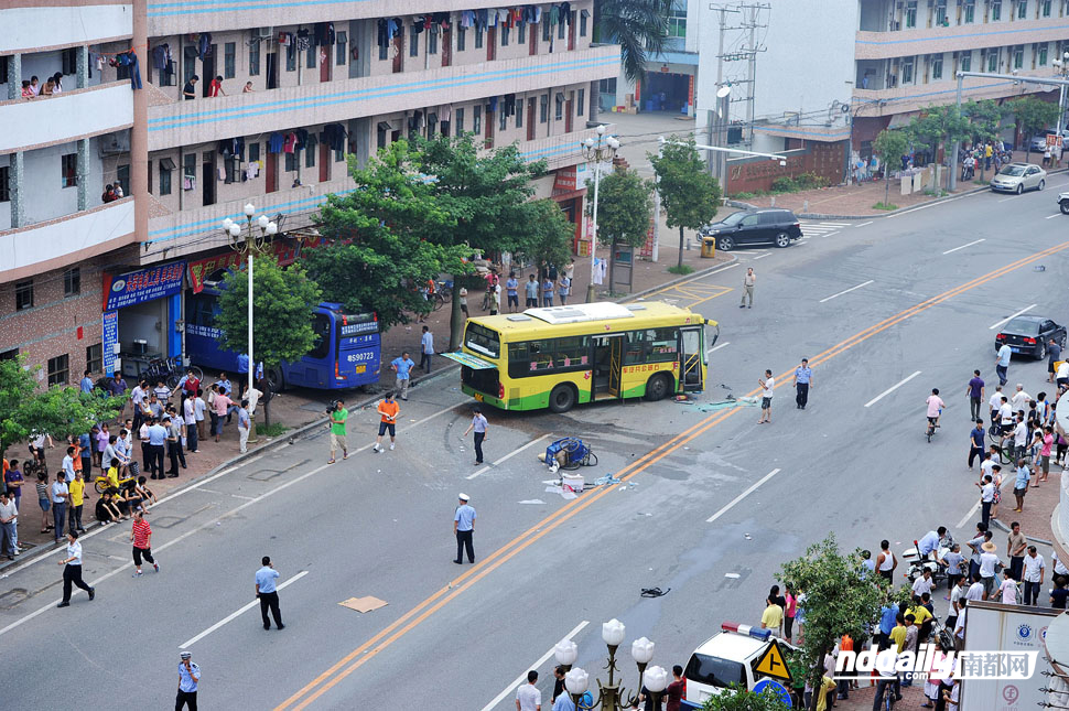 6月13日上午,一辆从石龙开往沙田的217路跨镇公交车(蓝色)行经石碣镇庆丰西路四甲路段时,先是与摩托车相撞,接着撞上前方一辆人力三轮车,再与对面车道另一辆公交车迎面相撞,最后直接冲进了旁边一家店铺内。车祸造成三轮车夫当场死亡,多名司乘人员受伤