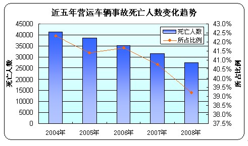 严重交通违法行为和重点时期、重点路段道路交通事故死亡人数同比下降。2008年,全国因超速行驶、疲劳驾驶、货车、拖拉机违法载人等交通违法行为导致事故死亡人数同比下降13.6%。国、省道上发生道路交通事故导致死亡人数同比下降14.2%。元旦、春节、清明、“五一”、端午、中秋、“十一”等主要节假日期间,全国道路交通事故死亡人数同比下降9.8%。 营运车辆事故总量稳步下降。2008年,营运车辆肇事导致事故死亡人数同比下降12.4%,降幅高于全国平均水平2.4个百分点。导致事故死亡人数所占道路交通事故总死亡人数的比例由2004年42.4%下降至2008年的39.2%。