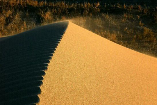 走了这条路,最大的感触就是筑路工人的伟大,他们用一把柏油和防沙带铸成的利剑,把这片世界第二大沙漠劈成两半,让我们可以进入这沙漠腹地领略大自然的壮丽。虽然沙漠风景有些单调,但老天爷特别眷顾我们,在我们造访塔克拉玛干的时候刚好沙漠里下完一场大雨,沙丘的迎光面是金黄色的沙粒,背光面被雨水凝固,使得原本单调的色彩有了明暗变化,也显得更加壮观。当地人告诉我们沙漠里下雨是非常罕见的,他们也已经多年没有见过了。