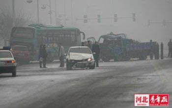 无独有偶。昨日18时30分左右,石安高速邯郸支漳河大桥段向南行驶的100多米车道上,3车发生相撞事故,后面的车因路滑刹车不及,导致20多辆车发生事故。事发后,高速交警上路疏导交通,至昨日21时许疏通出一条车道可供通行。