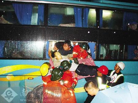 救援人员紧急转移受伤乘客。
