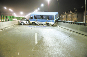4月7日零时10分许,市北交警大队接到报警,在东西快速路三百惠西侧500米处,一辆中巴车车头压住了一辆奥迪TT跑车的车头。