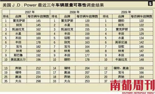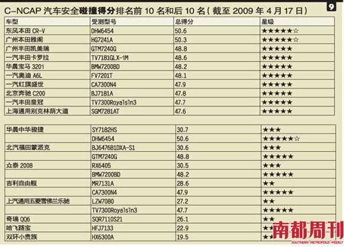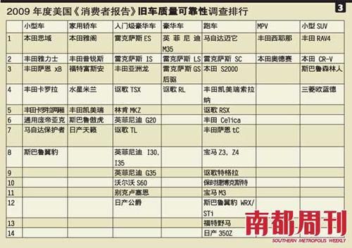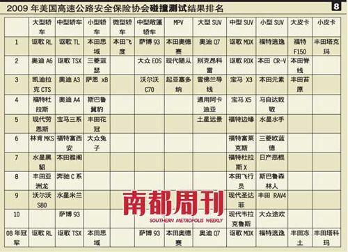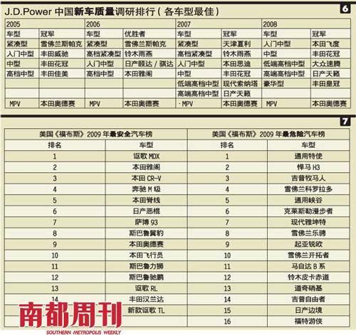 表1是《消费者报告》最近5年对各个车种的最佳推荐车型评选,我们可以看到,日本车占有较大优势。而在《福布斯》公布的2009年度最强汽车制造商排行榜中,丰田、本田则夺走了冠亚军(详见表2)。 这两个图表显示,日本车质量很可靠。在不可靠的车型中,日本车非常少。在以厂商为划分的可靠性和质量的调查中,本田以78分获得了冠军,其次是斯巴鲁(75分)和丰田(74分)。 ![]() ![]() 从综合素质排名来看,日本车有绝对优势,那么在耐用性和可靠性方面表现如何呢?这是很多消费者关心的两大指标,可靠耐用标志着质量过硬,也意味着维修费用更低,更令人放心。我们来看一下表3和表4,这是2009年度《消费者报告》旧车质量可靠性调查排行,这个排名是建立在140万辆汽车的基础上进行抽样获得的数据,这些车都是1999—2008年出厂,按照故障数目进行排名,故障数越少则排名越高。 从这两个图表上我们同样可以看到,日本车质量很可靠。在不可靠的车型中,日本车非常少,而且与很多中国消费者所了解到的信心有很大偏差的是,一些欧洲高端品牌的评分却很低,像奔驰、宝马、奥迪、保时捷、沃尔沃等都有一些不耐用车型。在以厂商为划分的可靠性和质量的调查中,本田以78分获得了冠军,其次是斯巴鲁(75分)和丰田(74分)。 我们再来看看另外一个美国最具权威性的调查——J·D·Power的车辆质量可靠性调查结果(VDS)。今年3月中旬发布的2009年汽车质量调查报告,有4.6万名美国各地车主(拥有该车3年以上)参加,涉及202个问题。排名则是根据每100辆车出现的故障数统计(详见表5)。 ![]() 显然,在J·D·Power的这个调查中,日本车同样表现不错。需要补充说明的是,在过去的十几年里,进入这一榜单前十位的大多是高档品牌,而且长期稳居前十名的非高档车只有丰田和本田。丰田的豪华车品牌雷克萨斯,甚至包揽了从1995年到2008年的冠军,堪称质量神话,美国人称之为“不犯错误的汽车”。1989年9月才诞生的雷克萨斯品牌,只用了三年就超越了奔驰和宝马,成为北美豪华车市场的销量冠军,凭的就是过硬的质量。 写到这里,或许有人又会说,你说的那些都是卖到美国的汽车,和中国市场上的日本车是两码事。“日本把一流车留作自己用,二流车销美国,三流车给中国”,这种说法在中国很有市场,甚至扩及到所有日本产品上。不过大家却没想过,在全球一体化的大环境下,在竞争激烈的汽车市场,有谁敢玩这种游戏?不管是美国车,日本车,德国车都是在坚持全球品质。 当然,中国的汽车研究远没有美国那么专业,但幸运的是J.D. Power亚太公司从2000年开始发布中国新车质量调研SM(IQS)报告,主要关注新车购买者在购车后2-6个月内遇到的问题。新车质量问题分为两大类——设计质量和生产质量(产品故障),并细分为八个类别:车身外观,驾车经历,配置、操控和仪表板,音响、娱乐、导航系统,座椅,空调系统(HVAC),车身内装,发动机和变速系统。综合得分以每百辆车所出现的问题(PP100)来衡量,分数越低表明发生故障的频率越小,质量也越高。 从最近四年的调查报告(详见表6)我们可以看到,中国市场的调查结果跟美国的情况差不多,日本车表现得同样表现不错。中国现在已成为仅次于美国的全球第二大新车市场,没有哪个汽车公司会忽略这样一个宝藏,那些认为外国车商欺负中国人甚至说什么故意造出差车来害中国人的言论,显然是没道理的,没有哪个厂商会自毁“钱程”。 ![]() 在《福布斯》的2009年最安全汽车和最危险汽车排行榜中。最安全车的前15名中日系车占据了13席另外两席是第四名的奔驰M型和第七名的萨博93;而在最危险的车型中,前10名没有一款是日系车。 不安全?看测试 上面三大机构的调查报告已经说明了一个事实,日本车质量并不是你听到和想象中的那么差,相反排名还不错。或许有人又会说,质量好也未必就安全。我们再看看《福布斯》的2009年最安全汽车和最危险汽车排行榜(详见表7)。 在这个榜单中,最安全车的前15名中日系车占据了13席,另外两席是第四名的奔驰M型和第七名的萨博93;而在最危险的车型中,前10名没有一款是日系车。 如果你还不信《福布斯》的一家之言,我们可以再看一看另一个汽车安全权威机构——美国高速公路安全保险协会(IIHS)的数据(详见表8)。 美国高速公路安全保险协会(IIHS)和中国汽车技术研究中心C-NCAP的碰撞测试都表明,日本车的安全性之高远超出你的想像。 ![]() ![]() 表8是2009美国高速公路安全保险协会测试结果排名,还附有2008年的各项第一名。2009年的测试结果显示,在所有11个车型种类中,本田囊括6项第一,是当之无愧的“安全之王”,其中轿车的所有4个车型冠军全部由本田囊括。在最主流的小型轿车组,也就是消费者购买最多的轿车组,日本车囊括了前5名,分别是本田思域、三菱蓝瑟、丰田萨恩、斯巴鲁翼豹、丰田花冠。 另外,全新本田讴歌TL在美国国家高速公路交通安全管理局(NHTSA)和美国高速公路安全保险协会所有安全评级中均获得了最高星级。这也使得讴歌旗下的所有车型包揽了美国两大权威机构安全测试中对于正面、侧面和尾部抗撞性的最高评级,这在汽车安全碰撞测试史上尚属首例。数据比口口相传要可靠,从碰撞结果上我们发现,日本车的安全性高出很多消费者想像的。 当然,我们也必须看看中国市场的情况。2009年4月16日,中国汽车技术研究中心C-NCA
