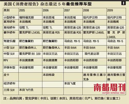 对于汽车这种普世产品,中国也流行着一些独具特色的说法,比如日本车的安全问题。随便逛一逛论坛或者汽车新闻的跟帖,你都可以看到贬低日本车几乎成了网上讨论汽车时的一项行为艺术,类似这样的一些言论充斥着互联网:“日本车铁皮薄得像易拉罐,最不安全”;“日本车省油是因为车轻,他们就会偷工减料节省成本”;“日本车在你看不见的地方就偷工减料,开始用还可以,几年后就不行了”...... ![]() 在世界范围内,似乎只有中国会流传这种说法,这并不奇怪。在我们这个极其缺乏专业精神的国度,汽车进入家庭又是个新事物,人云亦云的生命力往往还会很强,所以确有澄清的必要。 不耐用?看推荐 汽车不同于保健品、服装等,是一个很硬很客观的消费品,完全是拼真本事的东西。日本车到底怎么样?我们先看看国外的数据。 美国是汽车王国,也是全球最大的汽车市场,这里有全世界最专业和最严格的汽车消费评价体系。其中,又首推《消费者报告》杂志、J·D·Power和《福布斯》杂志三家的评价最被广泛认可。我们不妨先看看他们的数据。 《消费者报告》(Consumer Report)是美国人购物时的头号参考资料,拥有500多万忠实订户,它每年发布的汽车系列调查报告都被公认为最具有汽车购买指导价值,因为它通过专业测评和大规模用户反馈所得到的数据库是业界最全的,再加上它是全靠消费者捐助而维持的非营利机构,没有任何广告,其公正性和权威性一直受到业界认可。 近日,《消费者报告》公布了2009年汽车评价排名(Top Picks for 2009)。这一汽车综合素质评价共向130万汽车用户发放问卷,有260多辆车参加了测试,测评项目包括最严格的道路测试、耐用可靠性、安全测试等50多项内容。按照《消费者报告》汽车测试主管戴维·凯姆宾的说法,“所有进入最佳车型排行的车,都是性能、实用性、可靠性和安全性方面的佼佼者,这个榜单能为消费者购车提供绝好的参照”。 在《消费者报告》最近5年对各车种的最佳推荐车型评选中,日本车占有较大优势。而在《福布斯》公布的2009年度最强汽车制造商排行榜中,丰田、本田则夺走了冠亚军。 ![]() ![]()